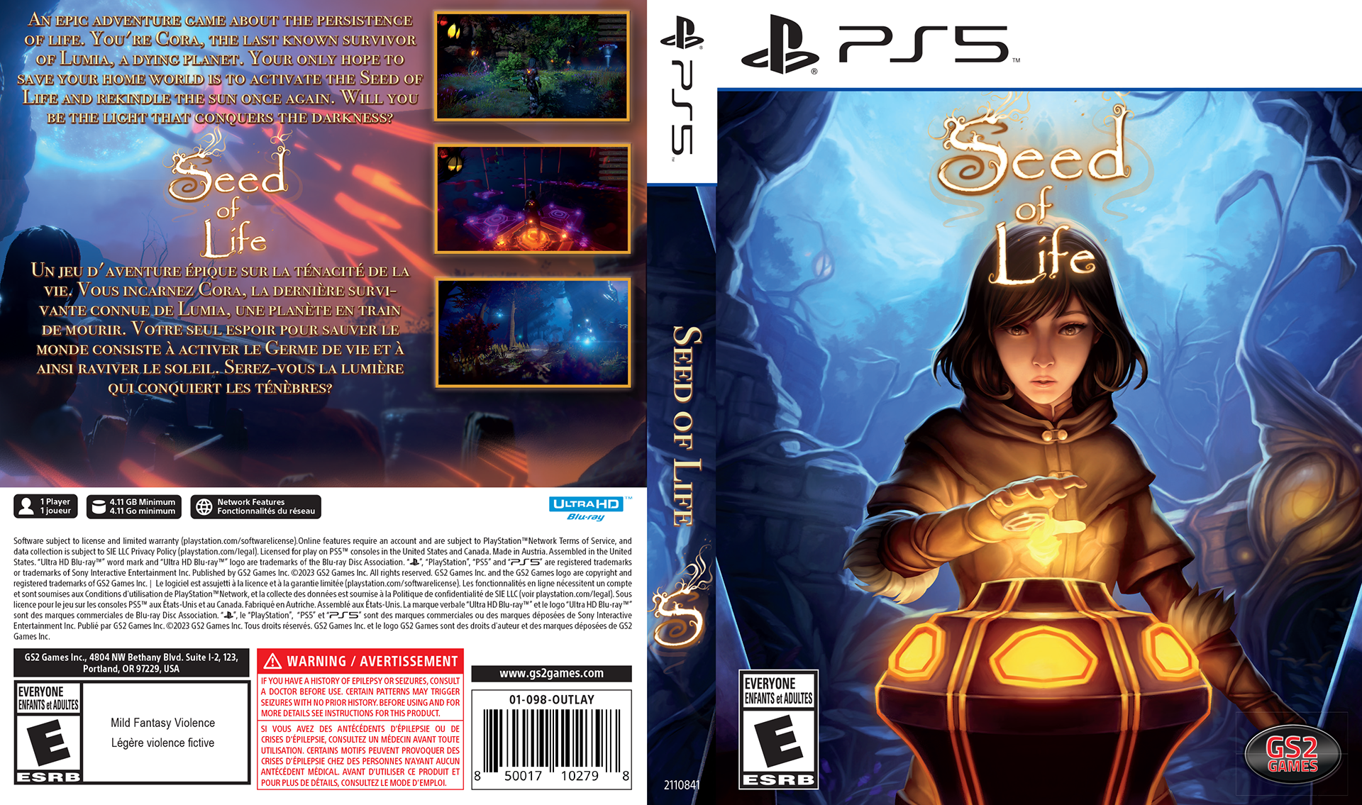 PS5 packaging that works. These two PlayStation® 5 sleeves—Adam Wolfe and Seed of Life—showcase the balance between creative marketing and strict production requirements. With dual-language packaging for Canada (English/French), space is at a premium: the design must capture the essence of the game while also fitting marketing copy, authentic gameplay screenshots, and Sony’s required elements—legal copy, compatibility icons, ESRB ratings, health warnings, and UPC. The result is packaging that remains on-brand, compliant, and compelling on the shelf.